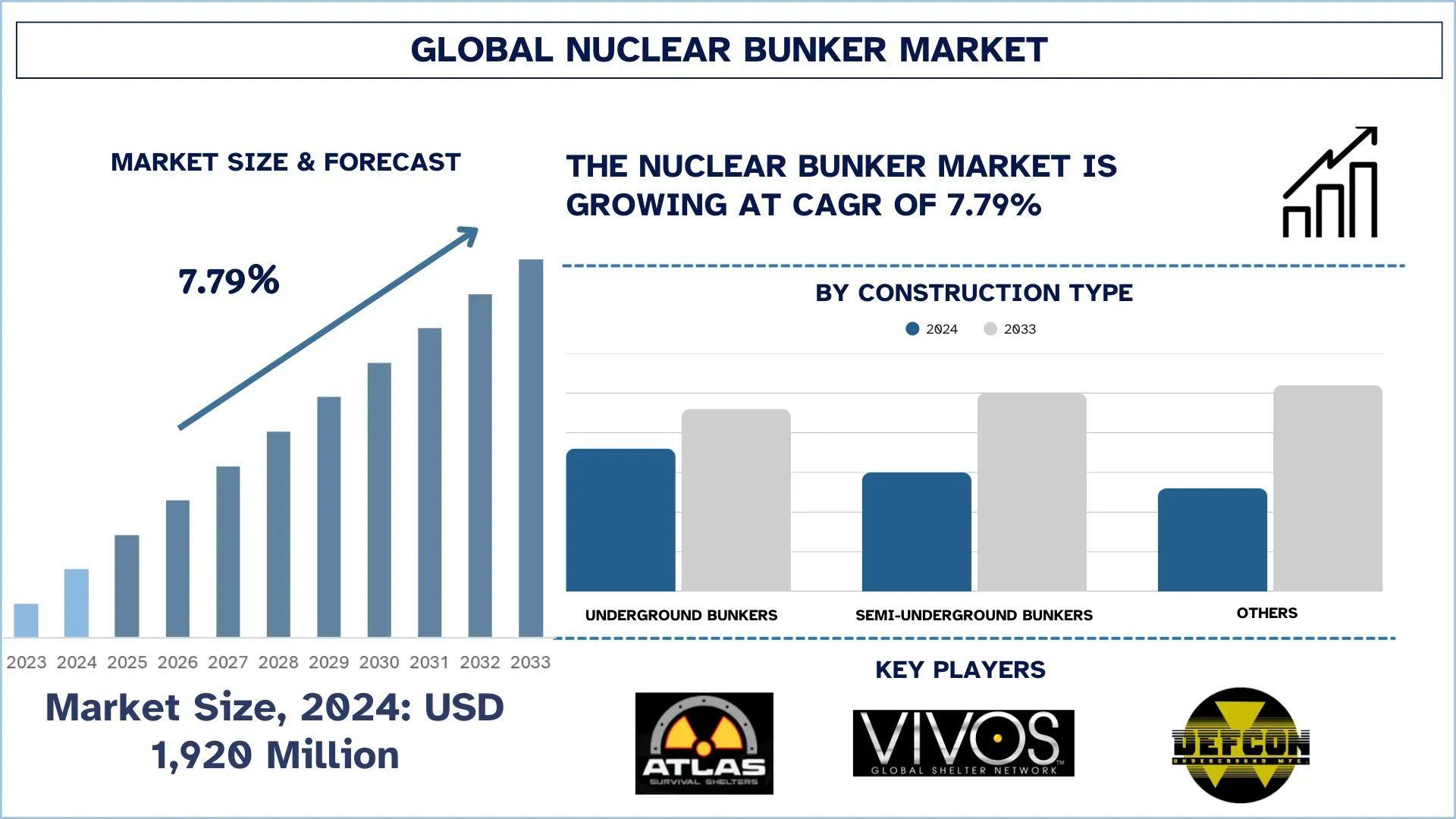 According to UnivDatos analysis, the rising geopolitical tensions and increased global defense spending are the major factors driving the growth of the Nuclear Bunker market. As per their “Nuclear Bunker Market” report, the global market was valued at USD 1,920 million in 2024, growing at a CAGR of about 7.79% during the forecast period from 2025 - 2033 to reach USD million by 2033.