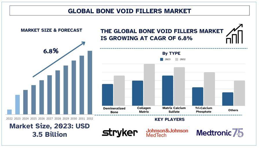 According to the UnivDatos, the increasing elderly population leads to a higher incidence of bone-related disorders and surgeries, innovations in biomaterials and surgical techniques enhance the effectiveness of bone void fillers, and the growing prevalence of conditions like osteoporosis and osteoarthritis will drive the global scenario of the Bone Void Fillers market. As per their “Bone Void Fillers Market” report, the global market was valued at USD 3.5 Billion in 2023, growing at a CAGR of about 6.8% during the forecast period from 2024 - 2032 to reach USD billion by 2032.