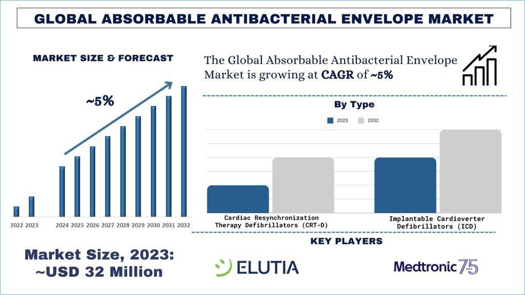 According to the UnivDatos, the increasing elderly population, who are more susceptible to cardiovascular conditions, leads to higher implantation rates of CIEDs, thereby increasing demand for absorbable antibacterial envelopes. will drive the scenario of the global absorbable antibacterial envelope as per their “Global Absorbable Antibacterial Envelope Market” report, the market was valued at USD ~32 million in 2023, growing at a CAGR of ~5% during the forecast period from 2024 - 2032 to reach USD million by 2032.