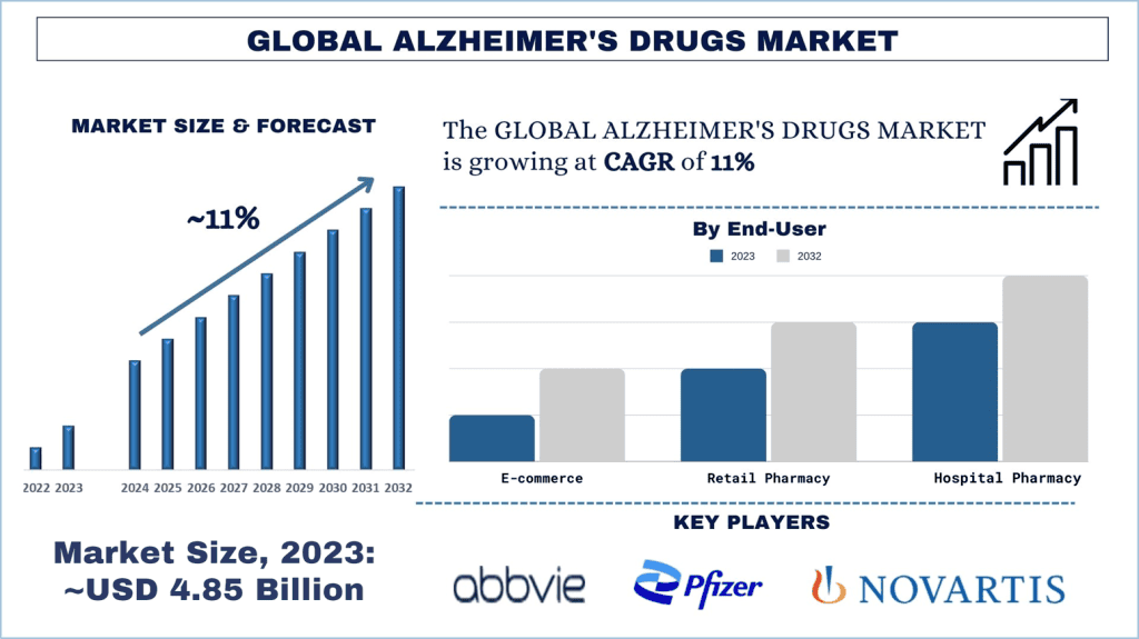 According to the UnivDatos, the high prevalence of Alzheimer's disease, an aging population, and substantial governmental and private funding will drive the scenario of the global Alzheimer’s Drugs and as per their “Global Alzheimer’s Drugs Market” report, the market was valued at USD ~4.85 billion in 2023, growing at a CAGR of ~11% during the forecast period from 2024 - 2032 to reach USD billion by 2032.