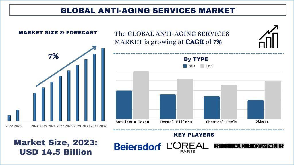 According to the UnivDatos, the Growing desire to look youthful and attractive, the popularity of medical tourism for affordable anti-aging treatments, and the increasing number of elderly individuals seeking anti-aging solutions will drive the global scenario of the anti-aging services market. As per their “Anti-Aging Services Market” report, the global market was valued at USD 14.5 Billion in 2023, growing at a CAGR of about 7% during the forecast period from 2024 - 2032 to reach USD billion by 2032.