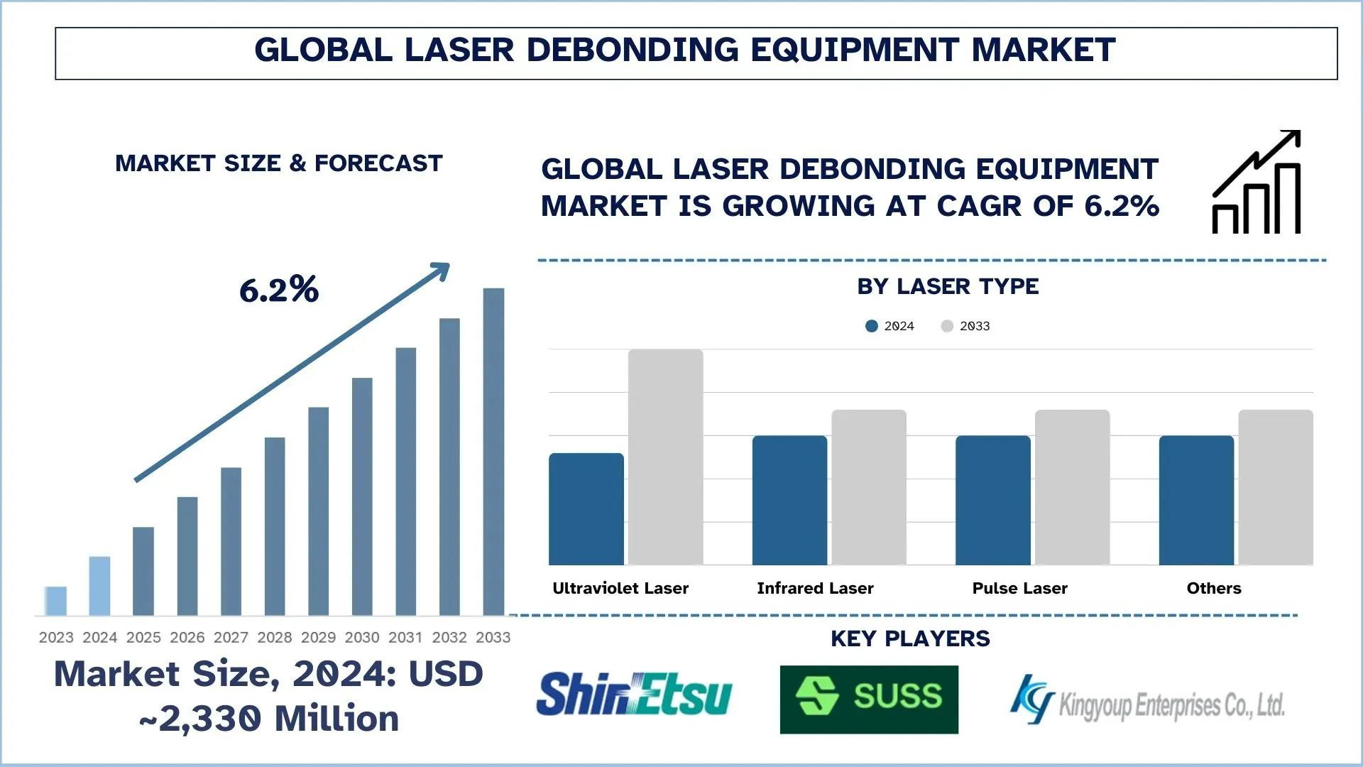 According to the UnivDatos, the rising demand for laser debonding among the end-user industries would fuel the demand for Laser Debonding Equipment to grow. As per their “Laser Debonding Equipment Market” report, the global market was valued at USD 2,330 million in 2024, growing at a CAGR of about 6.2% during the forecast period from 2025 - 2033 to reach USD million by 2033.